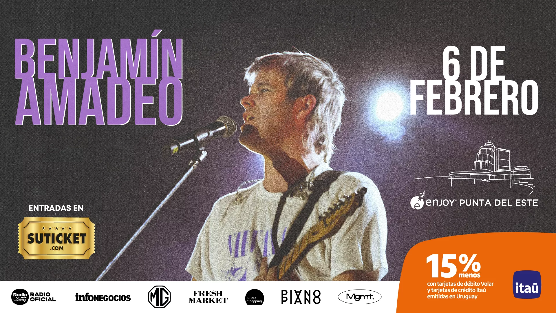 Además, el 6 de febrero, Benjamín Amadeo subirá al escenario de Enjoy Live en un momento de fuerte crecimiento artístico. Ganador de un Premio Gardel y con más de 150 millones de reproducciones en Spotify, el cantautor presentará las canciones de Salvando las Distancias, disco que lo llevó a agotar funciones en Argentina y a girar por la región y Europa.