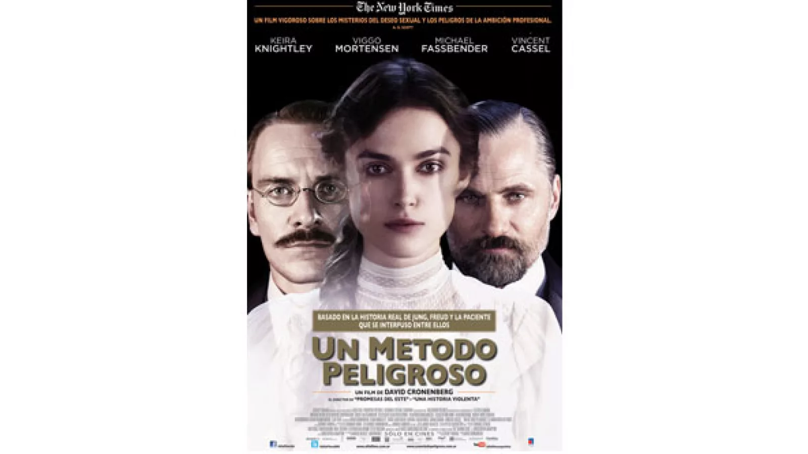 ... a principios del siglo XX en Zúrich, en medio de la turbulenta relación entre el joven psiquiatra Carl Jung (Michael Fassbender), su mentor Sigmund Freud (Viggo Mortensen) y Sabina Spielrein (Keira Knightley). A este trío se añade Otto Gross (Vincent Cassel), un paciente libertino decidido a traspasar todos los límites. Esta exploración de la sensualidad, de la ambición y del engaño llega a su momento cumbre cuando Jung, Freud y Sabina se reúnen antes de separarse definitivamente y cambiar la dirección del pensamiento moderno... decinos aquí, ¿Cuál fue la primer película en la que Viggo Mortensen y el director David Cronenberg trabajaron juntos?... pistas por acá.