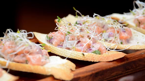 Aunque la mañana fue más primaveral que otoñal, la sopa de vegetales con la que abrimos el almuerzo estimuló la charla en la que no faltaron temas como el papel de la tecnología en el negocio del entretenimiento o el desarrollo de la hotelería en Montevideo. El plato principal nos puso en la difícil situación de optar entre un arroz negro con mariscos o una brótola rellena con jamón serrano y provenzal en salsa de maracuyá y pomelo rosado. Acompañamos con agua, refrescos, un Chardonnay de Giménez Méndez, y un tinto Carmenère-Merlot, de Oveja Negra. Al postre, un delicioso cheesecake de chocolate blanco y maracuyá.