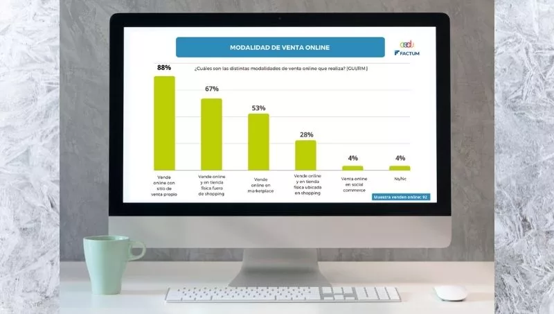 En este sentido, respecto a las modalidades de venta online, Factum encontró que el 88% lo hace en un sitio propio, el 67% lo hace tanto en la web como en tiendas físicas externas a los shopping, el 53% vende en un marketplace, el 28% lo hace online y en tiendas físicas dentro de los shopping y el 4% vende online en social commerce.
