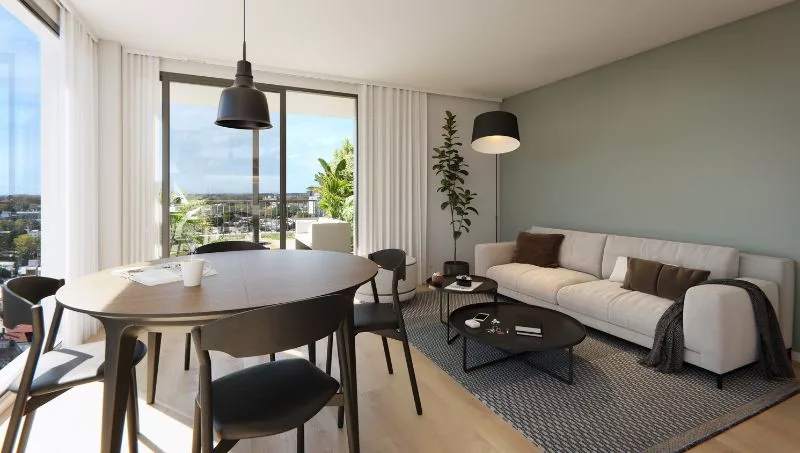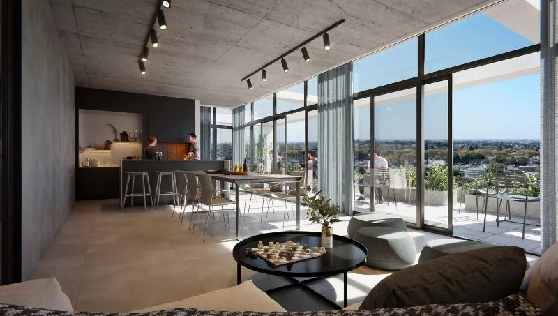 Por ejemplo, los enormes ventanales permitirán una mejor vista y entrada de luz, y los vidrios inteligentes junto a dispositivos de control externo ayudarán a regular la sombra y controlar la irradación del sol. Por su parte, el techo y las paredes con aislamientos conservarán una mejor temperatura en cada departamento, tanto en invierno como en verano.