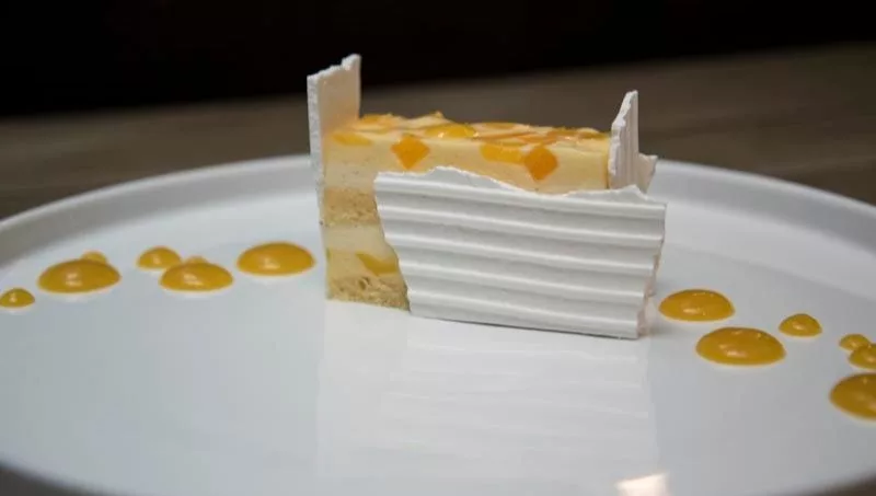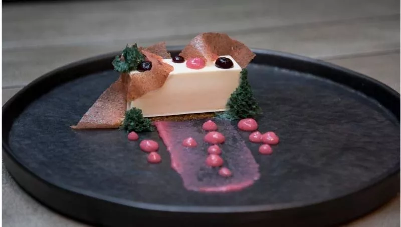 El Martín Fierro de Plantado Restaurant tiene: un bombón de queso cremoso,una base crocante de queso entre medio de la mousse y en donde habrá una jalea de membrillo, que luego acompaña el postre en diferentes puntos.