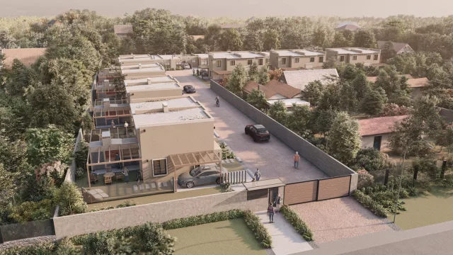 La primera etapa, compuesta por ocho unidades de dos dormitorios y dos baños distribuidos en dos plantas (tipología A), ya está completamente vendida. Las siguientes fases incluyen la tipología C, que ofrece casas de dos dormitorios en una planta, y la tipología B, que se caracteriza por viviendas más amplias, de tres dormitorios y dos baños.