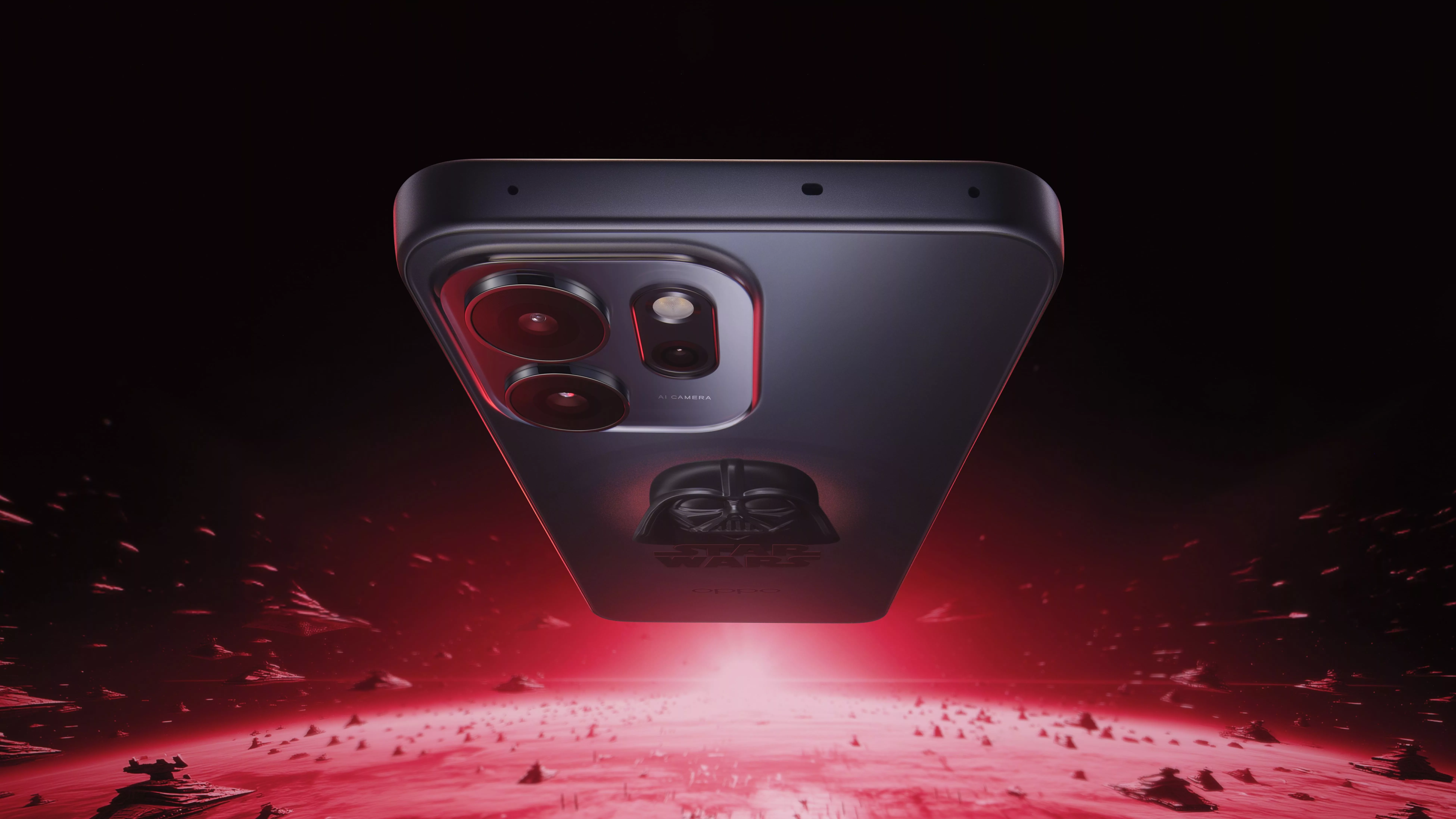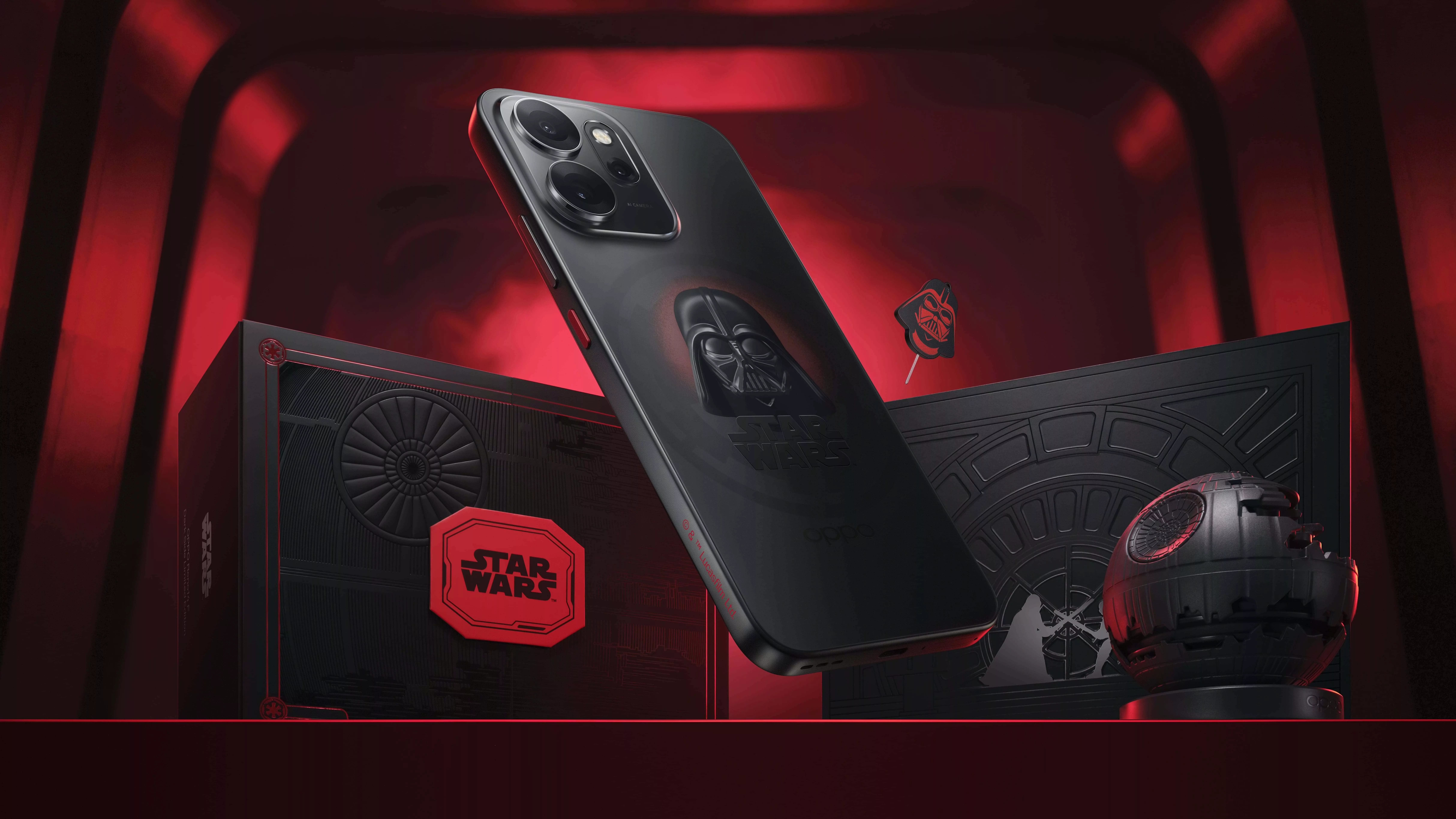 El contraste visual entre las insignias —con un logotipo brillante de Star Wars frente al grabado mate de OPPO— aporta elegancia, mientras que detalles como un botón lateral rojo y la marca de Lucasfilm completan el carácter de pieza de colección.