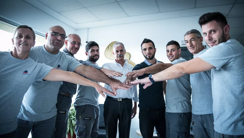 (De izquierda a derecha): Miriam Perera, encargada de Higiene y Mantenimiento; Juan Carlos Gómez, responsable de Depósito; Gustavo Marioni, responsable de Mantenimiento; Carlos Cammi, responsable Administrativo; Amaro Flores, director; Emiliano Rodríguez, encargado de Ventas; Luciano Martirena, auxiliar de Depósito; Gerardo Pereira, auxiliar de Depósito y Leandro Rocha, auxiliar de Depósito.