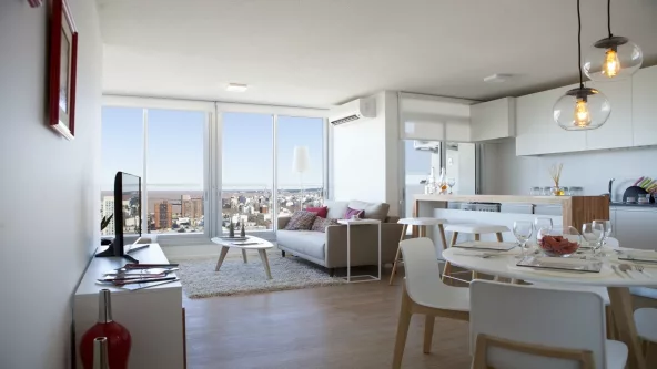 El apartamento de dos dormitorios, equipado por Pop Design, tiene vistas despejadas hacia la bahía, Ciudad Vieja y el Cerro de Montevideo. El edificio cuenta con servicios, espacios verdes, una plaza privada de más de 2.100m2 con juegos para niños y espacio de deportes para adultos, servicios de lavandería, bicicleteros, garajes para todas las unidades, barbacoas, parrilleros exteriores y solárium en el piso 25.