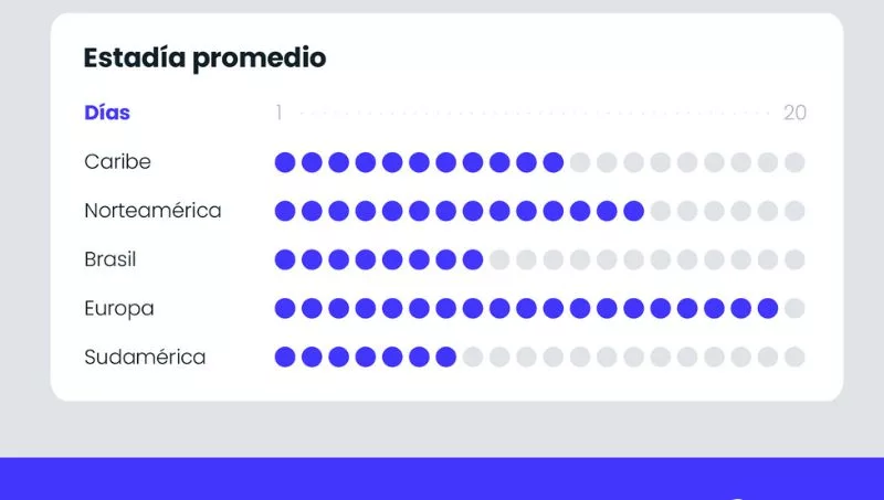 En cuanto a estadía promedio, los viajeros que seleccionaron Europa lo hicieron con una estadía promedio de 19 días, los que seleccionaron Estados Unidos un promedio de 14 días, los de Caribe 11 días y los viajes regionales, como suele suceder, tuvieron una estadía promedio más baja, que se ubica en los 7 días.