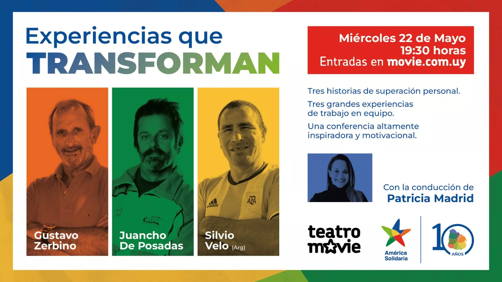 El miércoles 22 de mayo en la Sala Teatro Movie se llevará a cabo el evento “Experiencias que transforman” a beneficio de Fundación América Solidaria. Este año, el ciclo contará con la presencia de tres oradores: Silvio Velo, Juancho de Posadas y Gustavo Zerbino, quienes compartirán sus historias de superación personal y trabajo en equipo, moderados por la periodista Patricia Madrid.