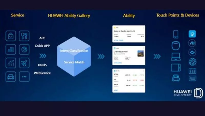Actualmente, más de 5.000 servicios de alta calidad han sido integrados a esta solución en China, incluyendo AI Lens, HiVoice, Global Search y HUAWEI Assistant, cubriendo 14 categorías verticales. HUAWEI Ability Gallery será lanzada globalmente en diciembre de 2019, habilitando servicios inteligentes capaces de alcanzar a usuarios de forma proactiva. Además, para mejorar la integración y eficiencia de servicios, los modos de desarrolladores de Content Ability, Card Ability y App Ability serán abiertos para brindar IDEs eficientes y 10 plantillas generales, además de soporte automático de adaptaciones de GUI y VUI. Esto significa que los desarrolladores pueden personalizar con múltiples categorías y servicios y así activar reglas en la plataforma para permitirle a los servicios creados por los desarrolladores mismos el cumplir con las necesidades de los usuarios, además de lograr una integración de bajo costo, ya que basta con hacer dicha integración una sola vez, y esta será distribuida a lo largo de varios dispositivos