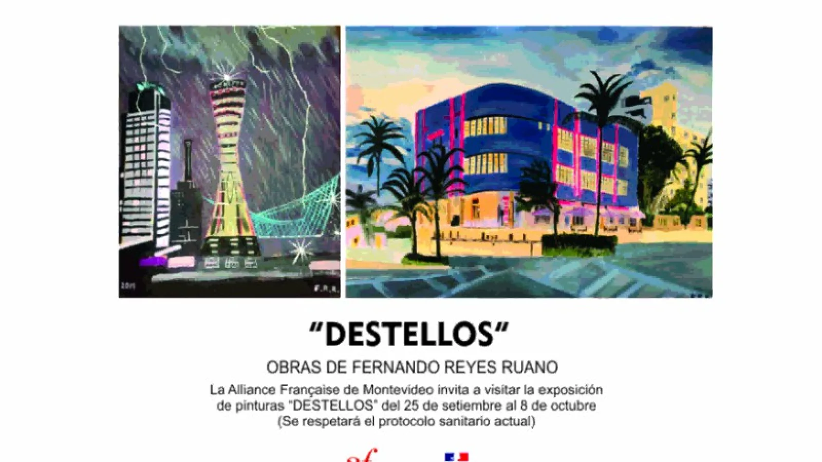 Las últimas obras pictóricas del artista Fernando Reyes Ruano continúan enfocadas en el paisaje, que ha sido siempre su tema de preferencia. En el caso de esta exposición que realizará en la sala de la Alianza Francesa, en el marco del “Concurso de Artes Visuales 2020” cabe destacar sus incursiones en el paisaje urbano. Y especialmente la dedicación y el estudio que ha desarrollado el artista, al citar en sus pinturas, obras singulares de la arquitectura Art Deco del Uruguay.