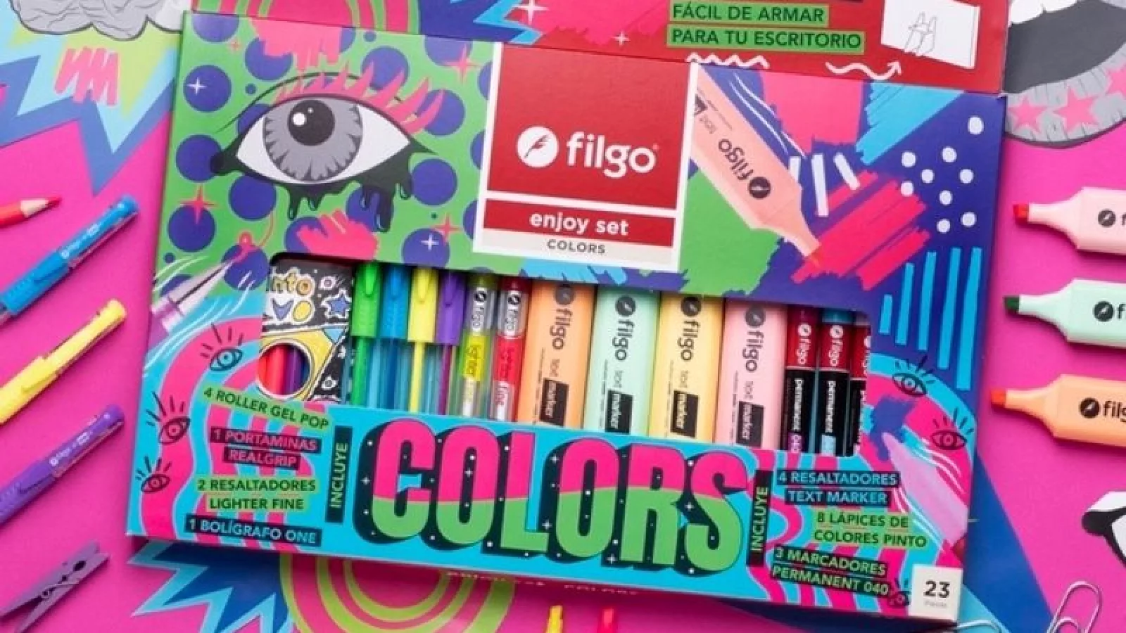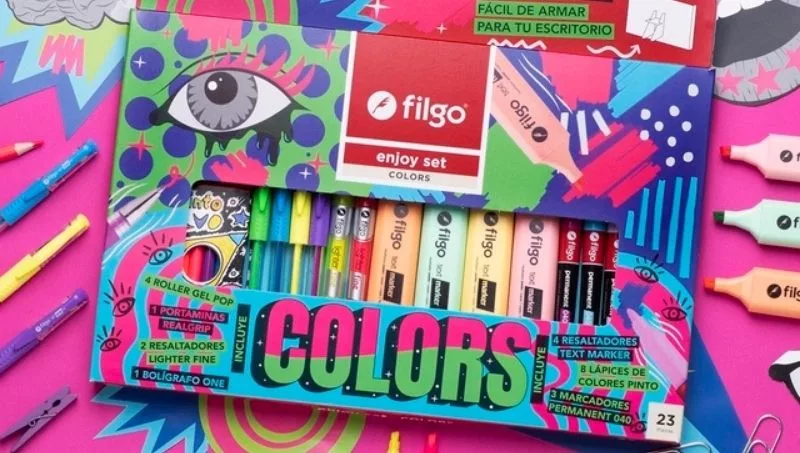 Una de las opciones de la promo de Tres Cruces es el set Filgo Colors, de 23 unidades, que tiene lápices, fibras, marcadores y resaltadores, así como otros artículos que lo hacen muy completo. Por otro lado, la alternativa Filgo Pastel, cuenta con 31 unidades e incluye los mejores colores en tonalidades pasteles, además de otras muchas cosas.