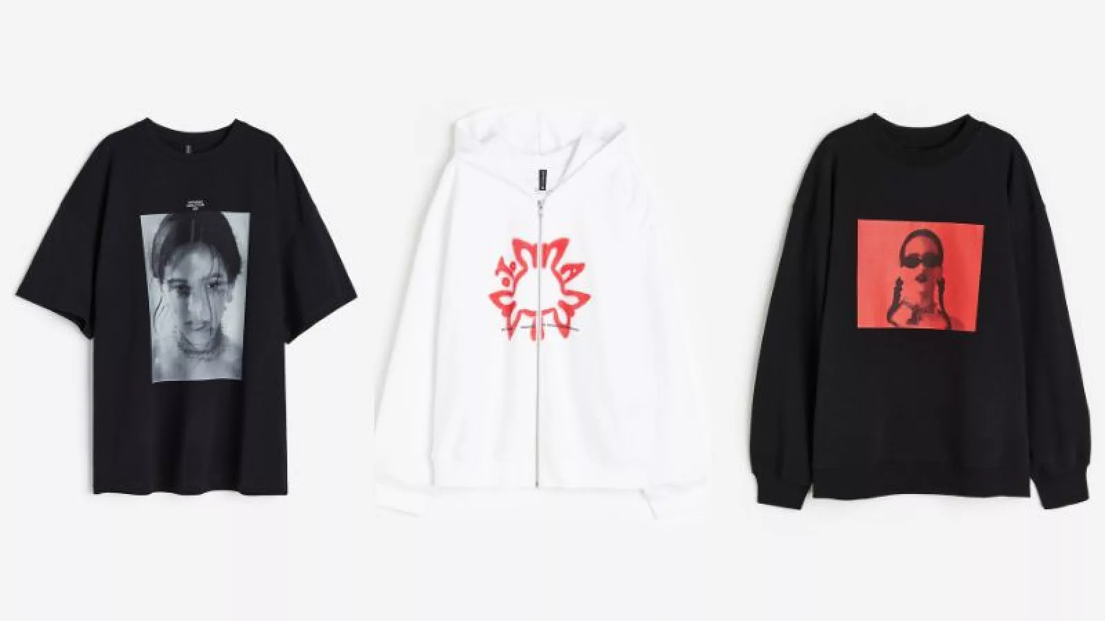 Se trata de dos remeras, un body y un canguro, en tonos de negro, blanco y rojo.