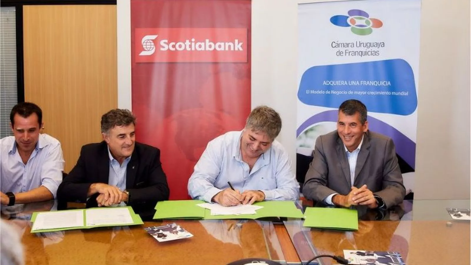 El acuerdo fue suscrito por Mauricio Peralta -Gerente Banca Minorista- y Alberto Noria -Gerente Banca Minorista Pymes- por Scotiabank, mientras que por Caufran lo hicieron Matías Mezzottoni -Secretario- y Marcel Burgos -Presidente-. Hector Russo -Gerente de Scotiabank Tres Cruces- y Blanca Prestes -Atención a Empresas y Pymes-, fueron parte fundamental de este proceso.