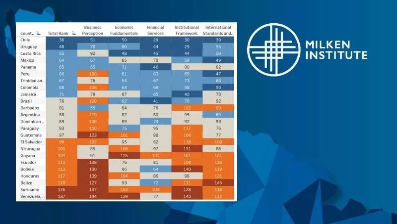 Para ilustrar más este ranking latinoamericano de Milken Institute, podemos agregar que el top 10 se compone de los siguientes países: a la cabeza Chile, seguido por Uruguay y Costa Rica; en cuarto lugar viene México, mientras que el top 5 lo completa Panamá. En el puesto número 6 de Latinoamérica está Perú, seguido por Colombia, luego Brasil, en el noveno lugar Argentina y finalmente, Paraguay cierra el ranking en la posición 10.