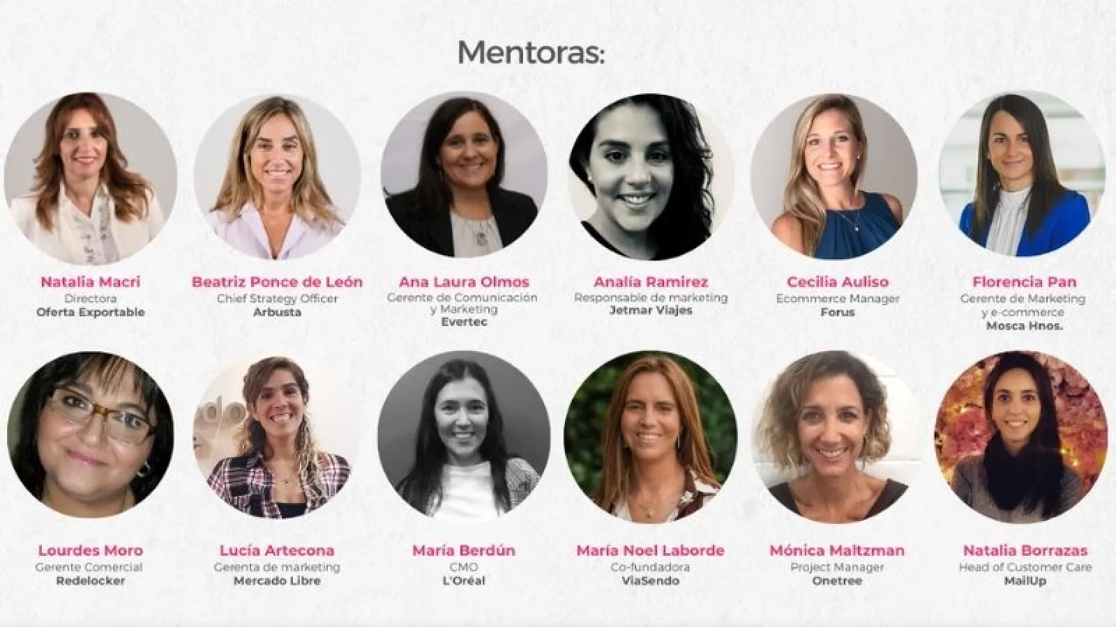 El grupo de mentoras está conformado por Natalia Macri, directora de Oferta Exportable y vicepresidenta de CEDU; Beatriz Ponce de León, chief strategy officer de Arbusta; Analía Ramírez, responsable de Marketing de Jetmar Viajes; Florencia Pan Arcelus, gerente de Marketing & e-Commerce de Mosca Hnos; Lucía Artecona, gerenta de Marketing de Mercado Libre; María Berdun, CMO de L´Oréal, entre otras.